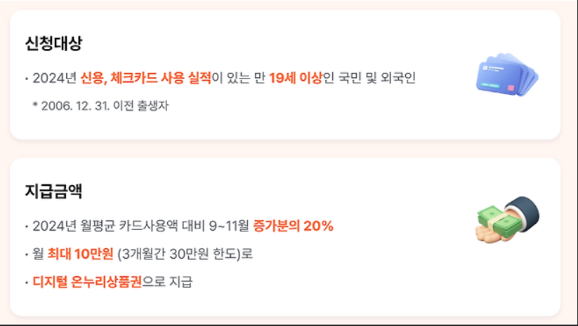 신청 대상은 2024년에 카드 사용 실적이 있는 만 19세 이상 국민과 외국인입니다.
