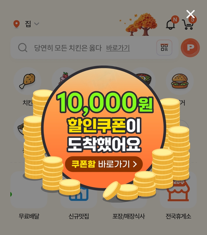 10월 1일이 되자마자 ‘땡겨요’ 앱에 들어갔어요. 평소에도 2만 원 이상 2회 주문 시 1만 원 쿠폰을 잘 쓰고 있었는데, 이번엔 매일 5천 원 즉시 할인이라니 더 반가웠어요.